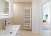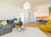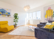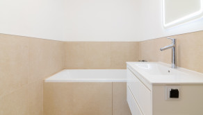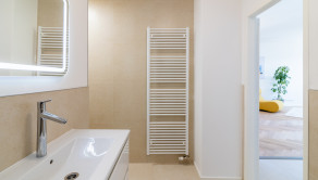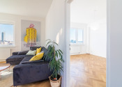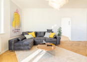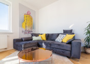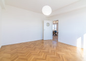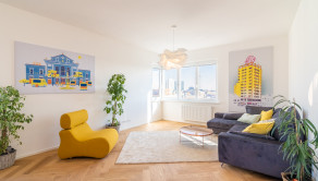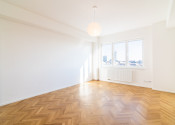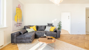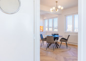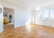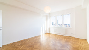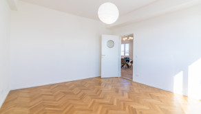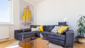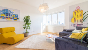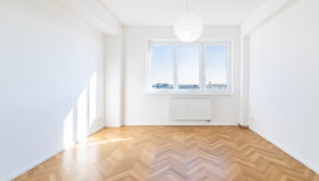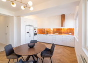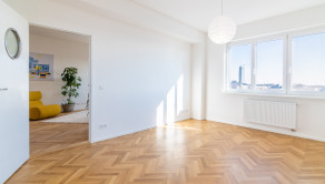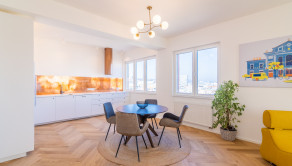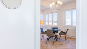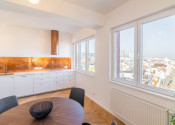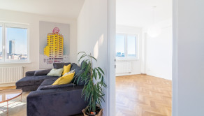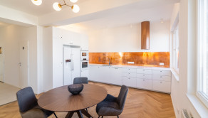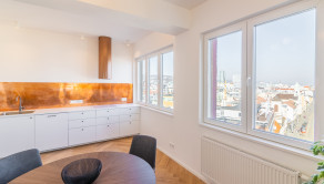 A unique large-sized bright 2- bedroom apartment for rent in the historic center of Bratislava is located on the 9th (10th) floor in the Manderlák building with an elevator. The apartment has wonderful views, it is soundproofed and therefore it is quiet living. The apartment consists of an entrance hall, a living room connected to a fully equipped kitchen and dining room, two separate impenetrable rooms, a bathroom with a bathtub, a toilet and a utility room. The apartment underwent a complete high-quality renovation in cooperation with an architect, where it was possible to preserve unique period elements such as the restored historical legendary "Manderlák" door with Kurh windows and the iconic entrance door with an opening window. The main architectural element of the kitchen is the copper screen above the kitchen counter, which is, as it were, a living element of the interior - copper is still working and its appearance is changing, thus connecting to the historical nature of the building. During the day, but also at night, the copper plates beautifully reflect the light and the apartment really shines. The new kitchen is equipped with high-quality Bosch appliances and an American refrigerator with an ice maker. The unique atmosphere of the apartment is completed by high ceilings, originally refurbished wooden parquet "trees" and new wooden parquet in the living room. The bathroom has travertine tiles, a separate bathtub and a walk-in shower. The separate toilet has a bidet shower. During the renovation, the windows in the apartment were replaced with new plastic ones, new distribution systems (electricity, water, waste), heating, leveled floors and partitions. The apartment building has two new elevators and a main entrance with two chip doors - so it's really safe living. The house has new central heating, but it is independent, you can heat it up at any time, even in summer. Possibility to convert into a 4-room apartment by simply adding one partition. The apartment is rented furnished, as it is in the photos. It is available immediately. No cellar and parking, but there are several long-term rental options in the vicinity.