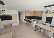 The apartment consists of an entrance hall with custom-made built-in wardrobes, a spacious living room connected to a fully equipped kitchen, a bedroom with a double bed and another room. The apartment has a larger terrace, a cellar and a garage for one car.