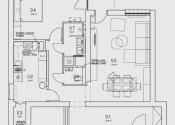 Byt pozostáva zo vstupnej chodby so šatníkom, obývacej izby, kompletne vybavenej kuchyne so špajzou, kúpeľne so sprchovacím kútom a samostatnej toalety. K bytu prislúcha balkón (4,3 m2), pivnica a k dispozícii je verejné parkovanie na ulici, resp. pod domom.