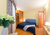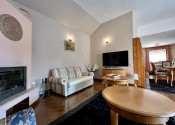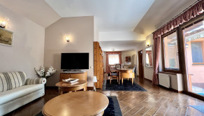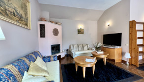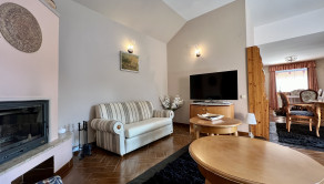 Dom je dvojúrovňový. Z priestrannej dvojgaráže, kde je možnosť zaparkovať dve autá za sebou, bicykle a motocykel, sa schodiskom dostávame do obývacej izby s krbom. Tá je jedálňou spojená s kuchyňou, ktorej súčasťou je aj špajza. Na tomto bezbariérovom podlaží sa nachádza tiež spálňa, ďalšia samostatná izba, šatník, dve kúpeľne s vaňou, sprchovacím kútom a dve toalety. Z haly je výstup na priestrannú prekrytú terasu so sedením a chodníkom na prechod na záhradu.