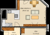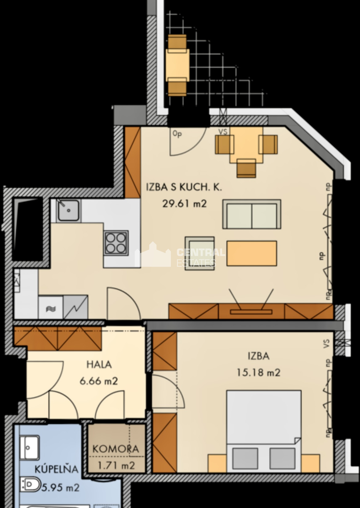 Byt pozostáva zo vstupnej presiene, obývacej izby prepojenej s plne vybavenou kuchyňou, spálne, šatníka, domácej kancelárie, kúpeľne s vaňou a toalety. Prislúcha k nemu prekrytá lodžia (3 m2) s krásnym výhľadom na mesto a Kolibu a dve komory. Je možné prenajať si k nemu parkovacie státie v garáži za príplatok 120 eur/ mesiac.