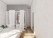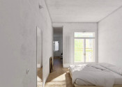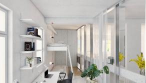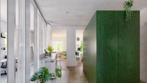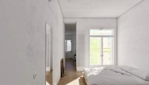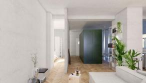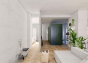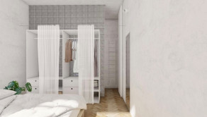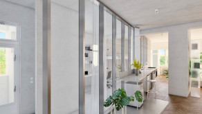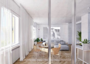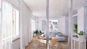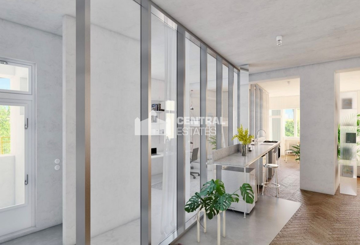 Premyslenou rekonštrukciou s dôrazom na detail a s konceptom otvorenej dispozície, vznikol unikátny bytový priestor s výmerou 105 m2 so stropmi vysokými 3 m, s drevenými parketami v klasickom tehlovom bytovom dome, kde sa nachádza len 12 bytov a na poschodí je len jeden sused. Orientácia bytu na V a S/Z poskytuje dokonalé presvetlenie interiéru počas celého dňa. Dominantná sklenená deliaca stena dispozične oddeľuje priestory podľa funkcie, pôsobí elegantne vďaka kombinácii skla s hliníkom a umocňuje výnimočnosť, ako aj nadčasovosť riešenia interiéru.