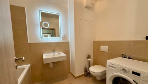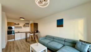 Byt pozostáva zo vstupnej haly, kúpeľne s vaňou a toaletou, jednej spálne, obývacej izba prepojenej s kompletne vybavenou kuchyňou a jedálenskou časťou. K bytu prislúcha balkón, pivnica a parkovacie státie pre jedno auto.
