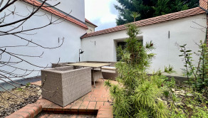 Zachovalé historické múry v obývacej miestnosti, zrekonštruované historické drevené okná, oplotenie záhrady - pôvodný múr stredovekej stavby dodávajú bytu nadčasový nádych.