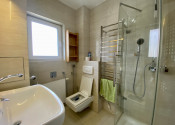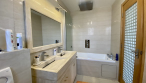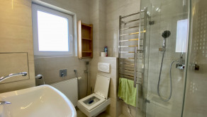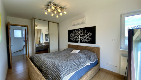 Nadštandardný 2-podlažný 5-izbový rodinný dom- novostavba na prenájom v Bratislave je situovaný v tichej ulici v Novom meste.  Pozostáva zo vstupnej haly, priestrannej obývacej izby prepojenej s plne vybavenou kuchyňou (chladnička s mrazničkou, mikrovlnná rúra, umývačka riadu, elektrická rúra a varná doska, digestor) na prvom podlaží, z 3 samostatných spální so vstavanými roll-door šatníkmi so zrkadlom na druhom podlaži, spoločenskej miestnosti v suteréne (sauna, biliard), 4 kúpeľní (jedna s vaňou a ostatné so sprchovacím kútom) a 2 samostatných toaliet. V dome je klimatizácia, internetové pripojenie, sauna, prislúcha k nemu balkón, veľká terasa (50 m 2) na poschodí domu s posedením, grilom a výhľadom na vinohrady a predzáhradka pred domom. K dispozícii sú parkovacie miesta pre dve autá.