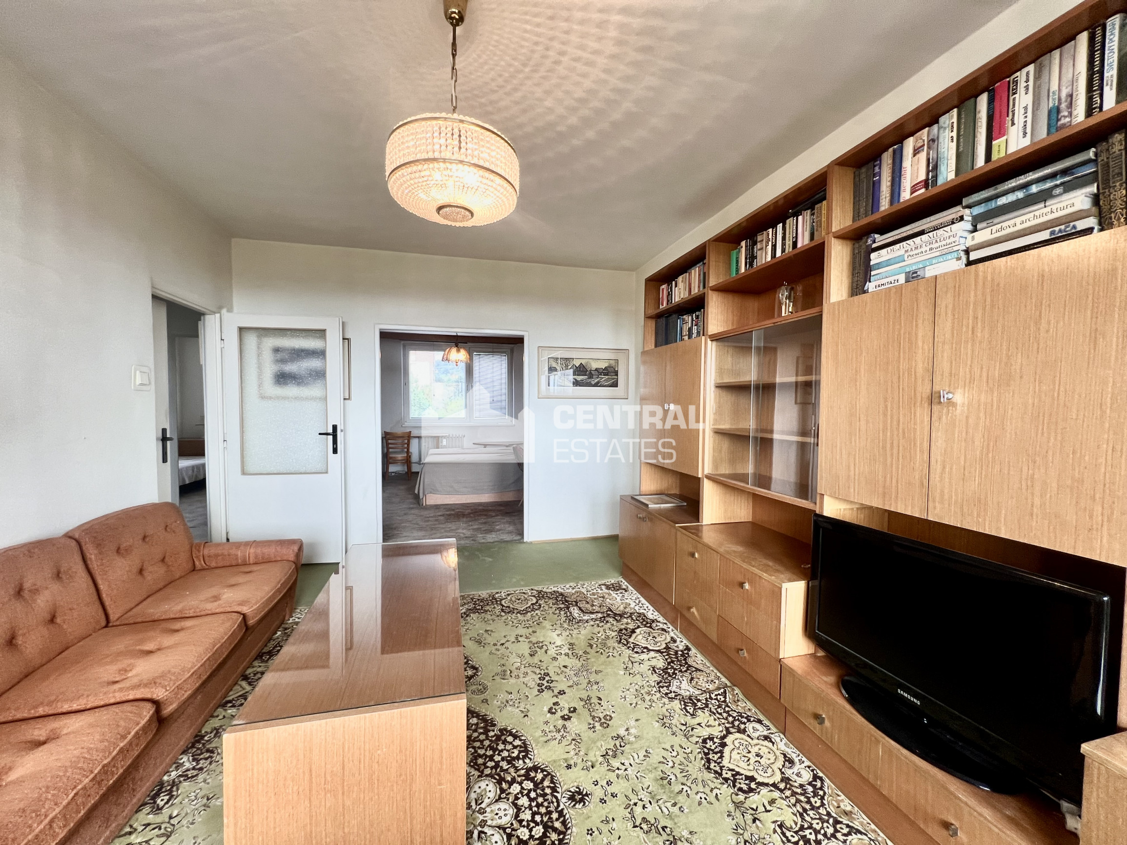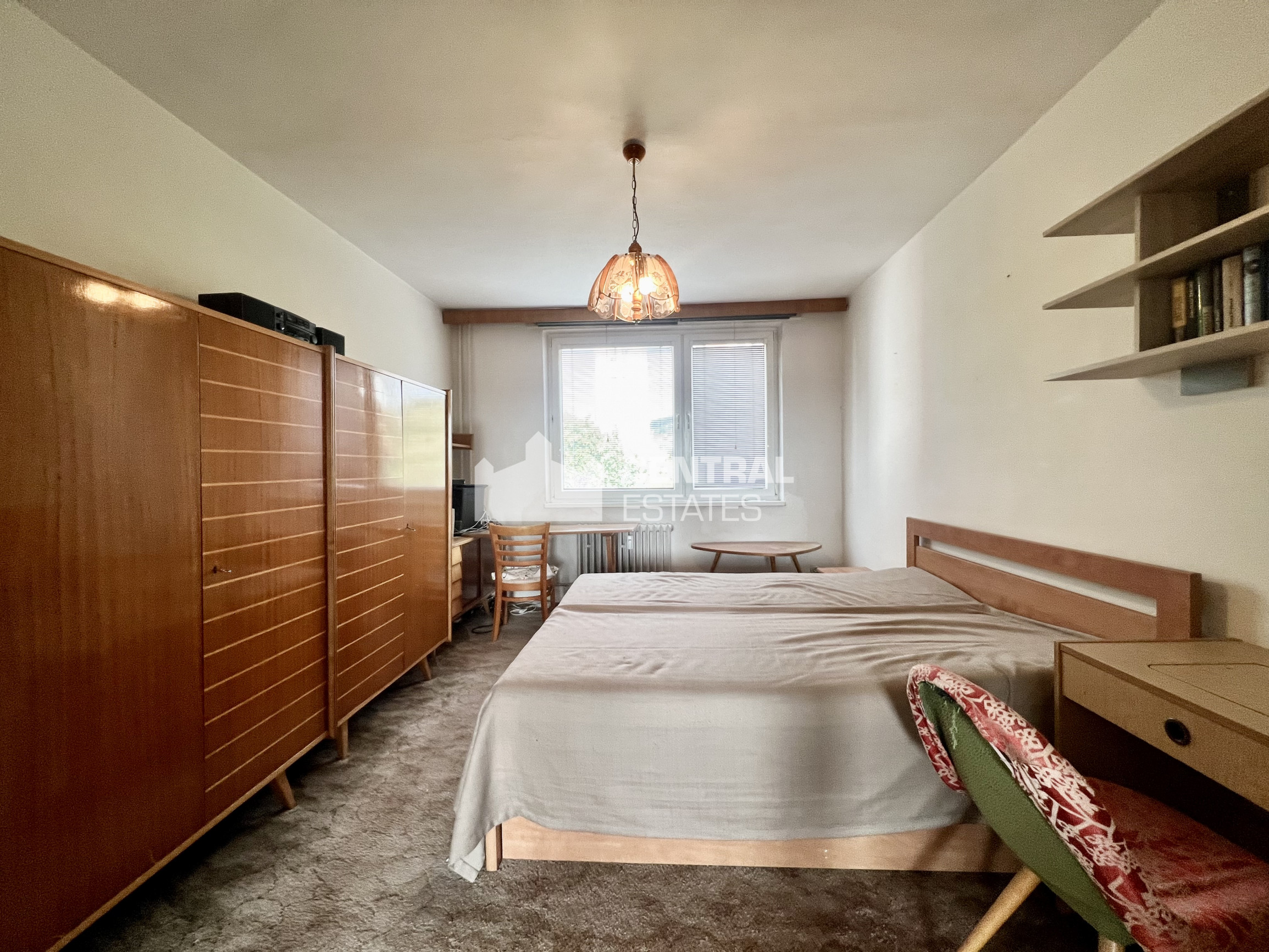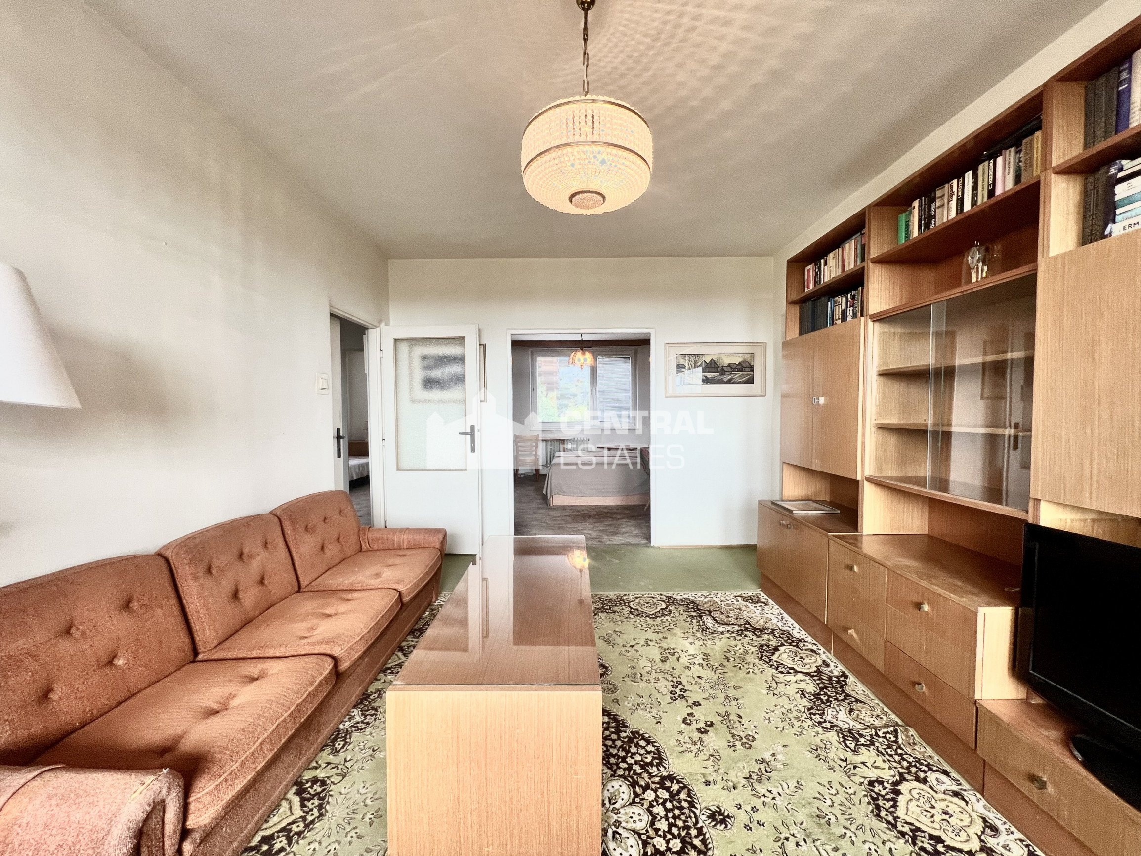 Byt pozostáva zo vstupnej chodby, slnečnej obývacej izby, hlavnej spálne, samostatnej kuchyne so špajzou, dvoch ďalších izieb, kúpeľne s vaňou a toalety. Pozdĺž obývacej izby a kuchyne sa tiahne lodžia, ktorá je prístupná z oboch izieb. Byt je klimatizovaný, boli v ňom vymenené plastové okná, inak je v pôvodnom stave. Je klimatizovaný. Parkovanie je verejné v okolí domu. K bytu je možné po dohode prenajať si garáž. Bytový dom bol dávnejšie zateplený.