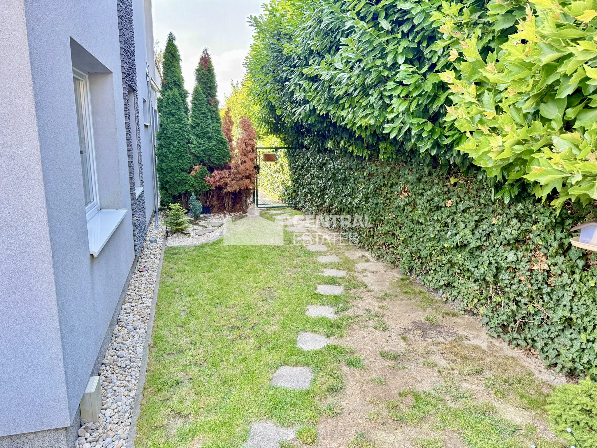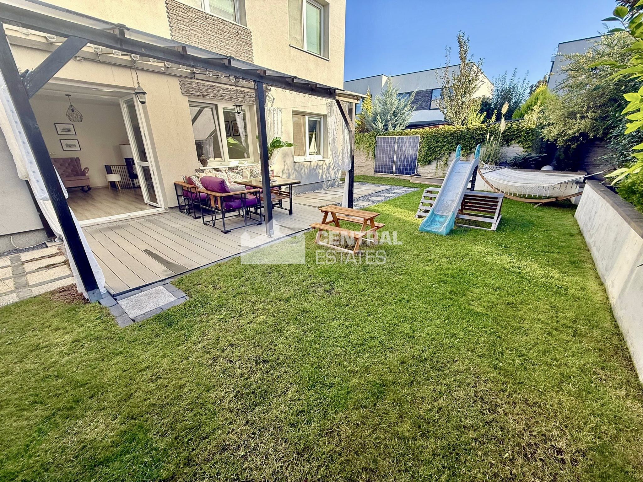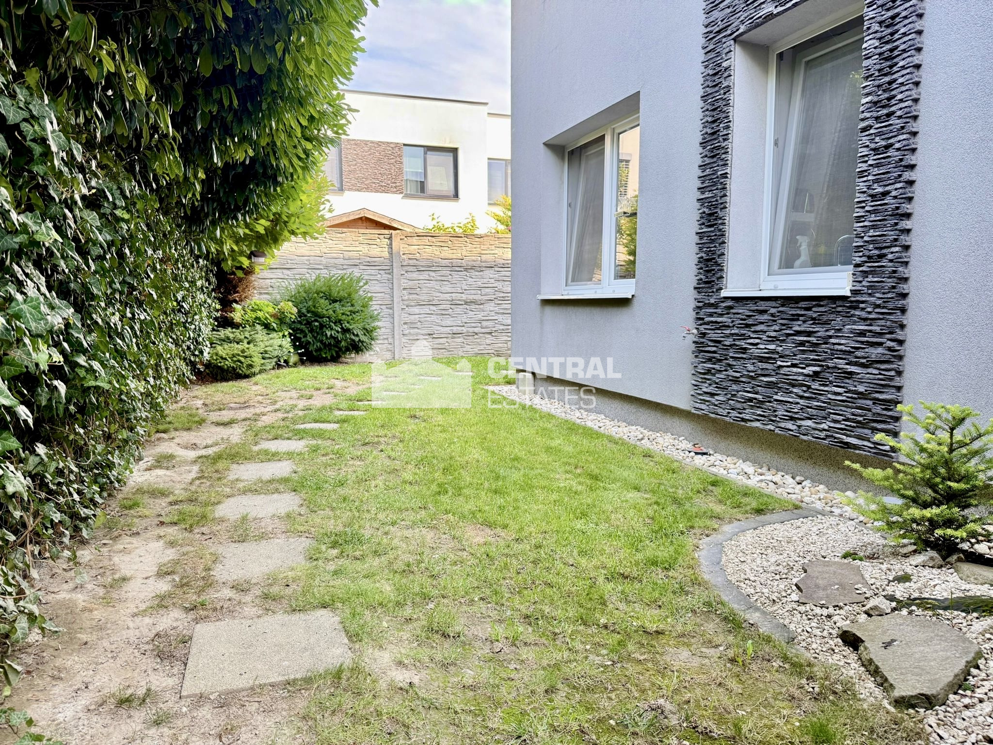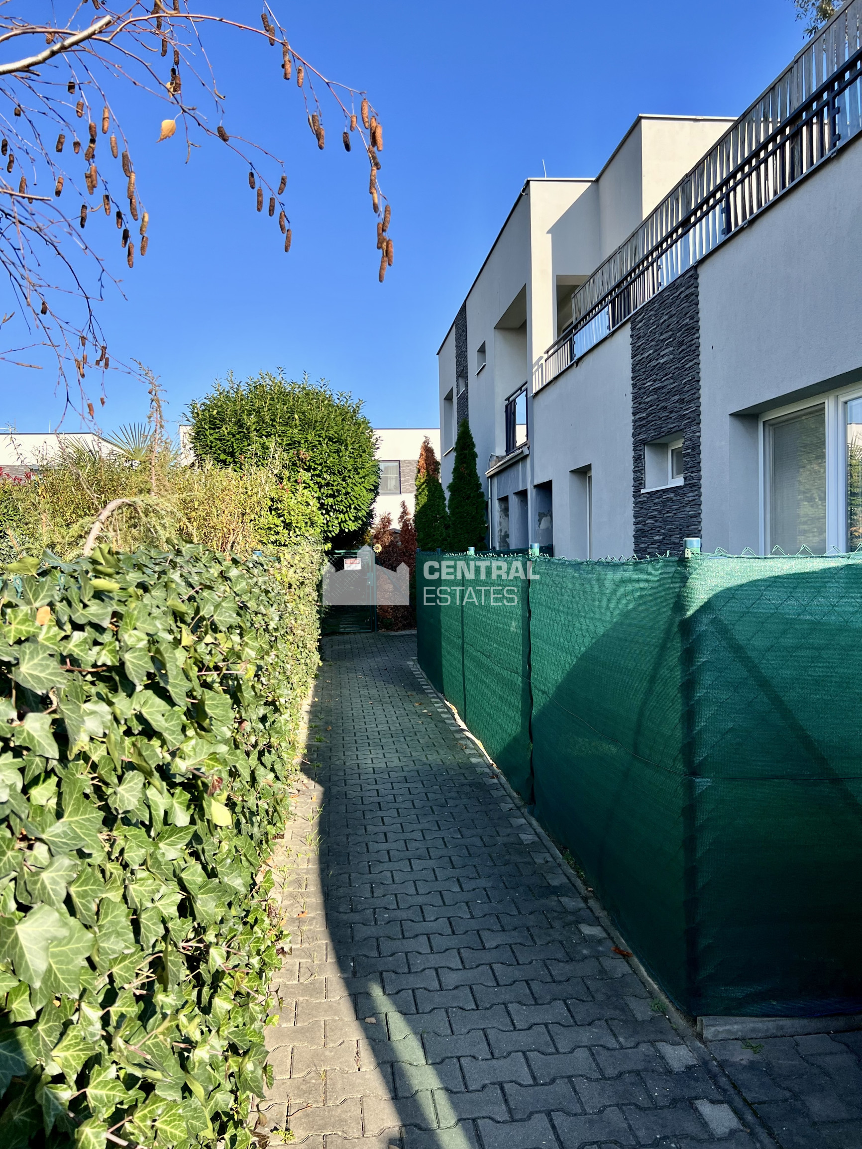 K bytu prislúcha terasa a záhrada o výmere 179 m² s automatickým zavlažovaním. Na pozemku je umiestnený záhradný domček na náradie, bicykle a sezónne veci, sklad s dodatočným úložným priestorom a je tu tiež dostatok priestoru pre bazén. Prestrešená terasa je ideálnym miestom na relax a grilovačky. Vyjsť z pozemku je možné aj zadnou bránkou s prístupom von pred dom. K bytu prislúchajú dve vonkajšie parkovacie státia (spolu 20 m²) priamo pred bytom.