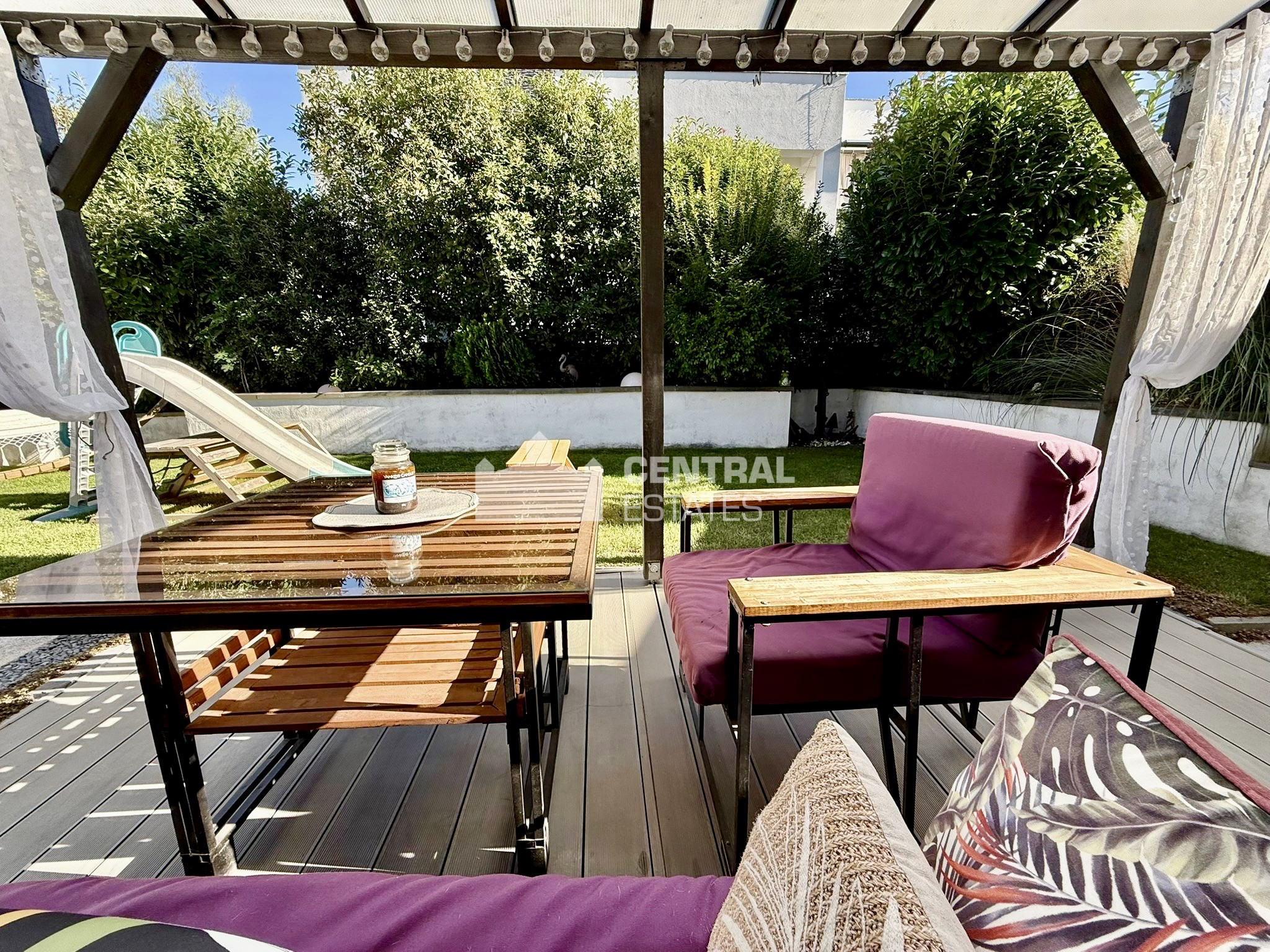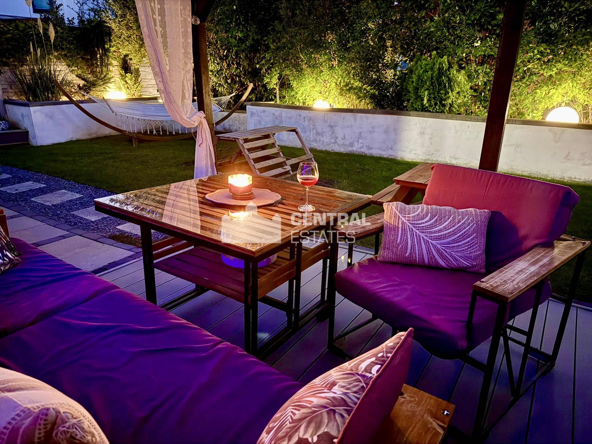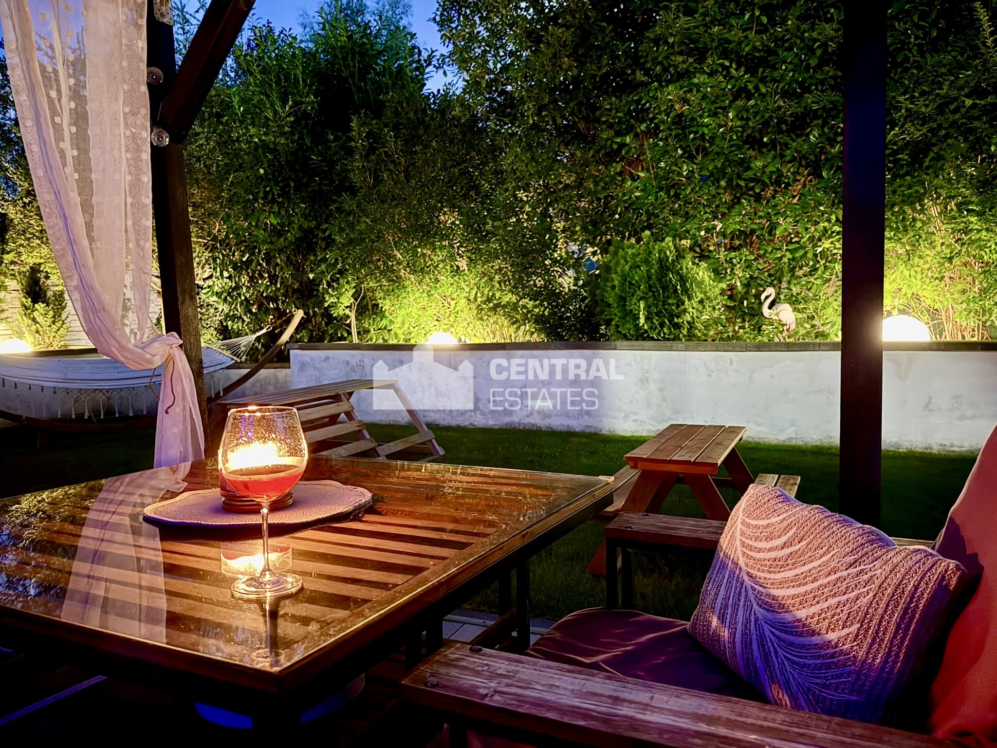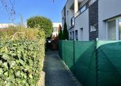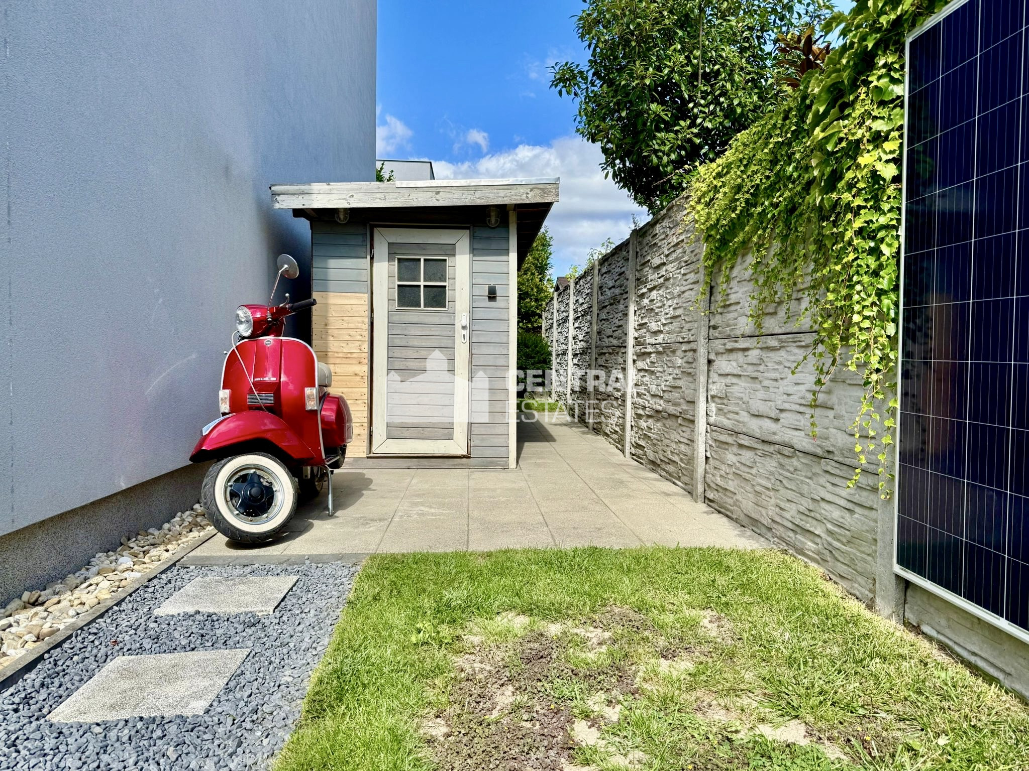 K bytu prislúcha terasa a záhrada o výmere 179 m² s automatickým zavlažovaním. Na pozemku je umiestnený záhradný domček na náradie, bicykle a sezónne veci, sklad s dodatočným úložným priestorom a je tu tiež dostatok priestoru pre bazén. Prestrešená terasa je ideálnym miestom na relax a grilovačky. Vyjsť z pozemku je možné aj zadnou bránkou s prístupom von pred dom. K bytu prislúchajú dve vonkajšie parkovacie státia (spolu 20 m²) priamo pred bytom.