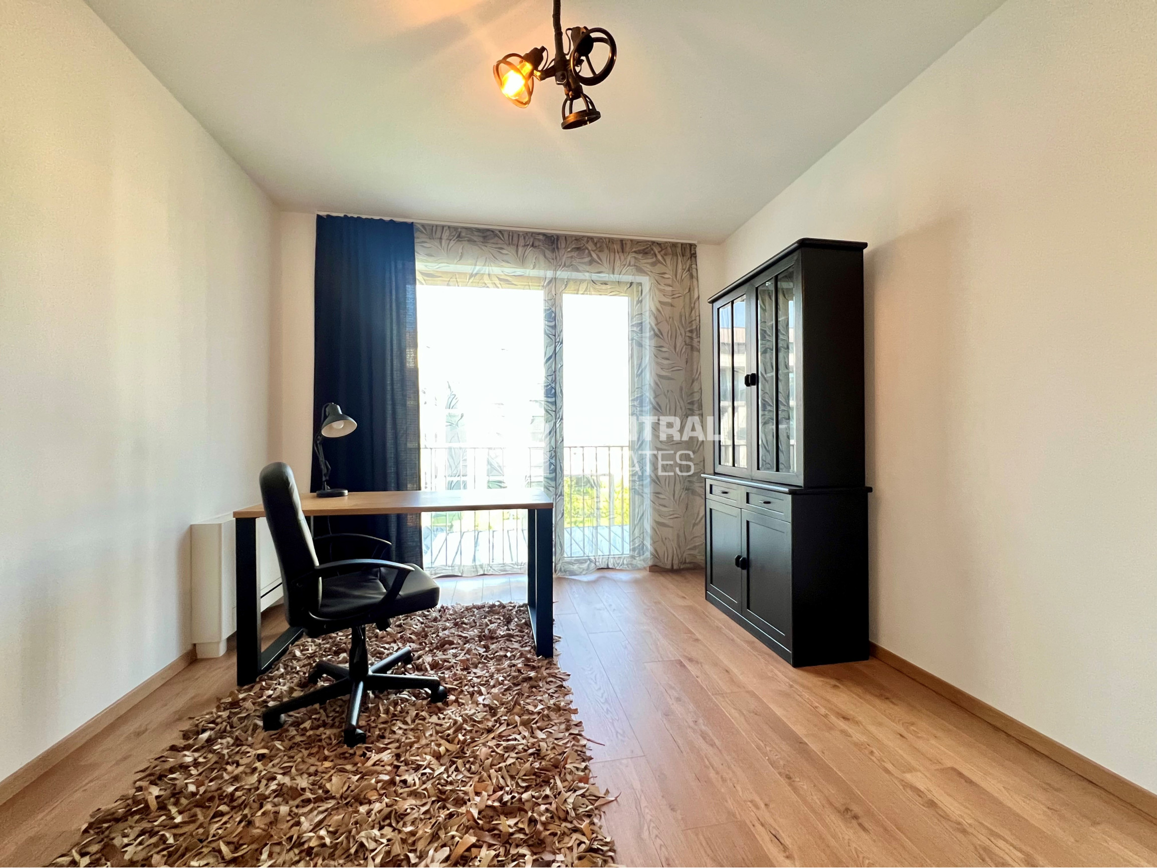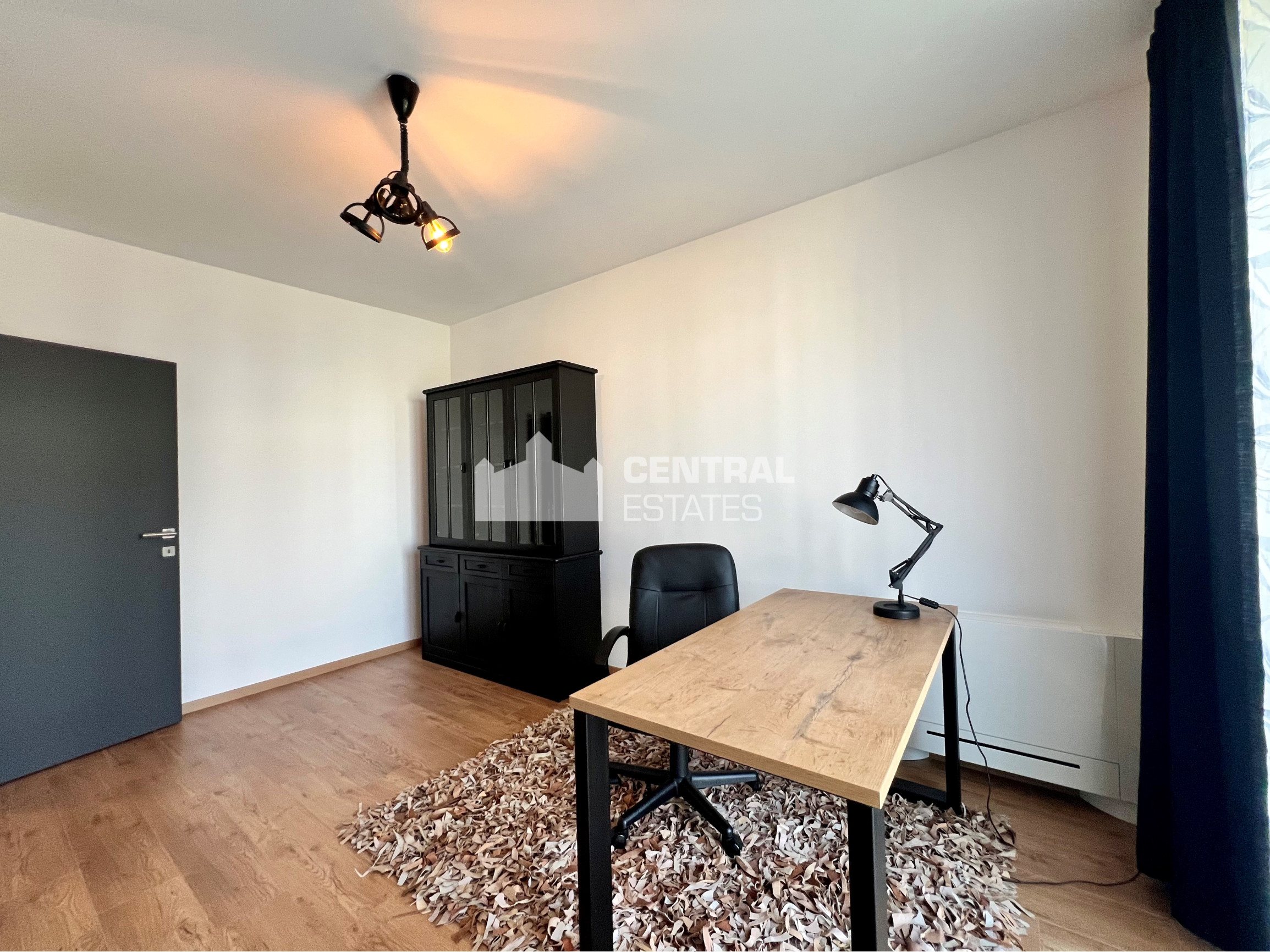 Byt pozostáva zo vstupnej haly, obývacej izby prepojenej s plne vybavenou kuchyňou a jedálenskou časťou, dvoch samostatných spální, prácovne, kúpeľne s vaňou a dvoch toaliet (jedna samostatná).