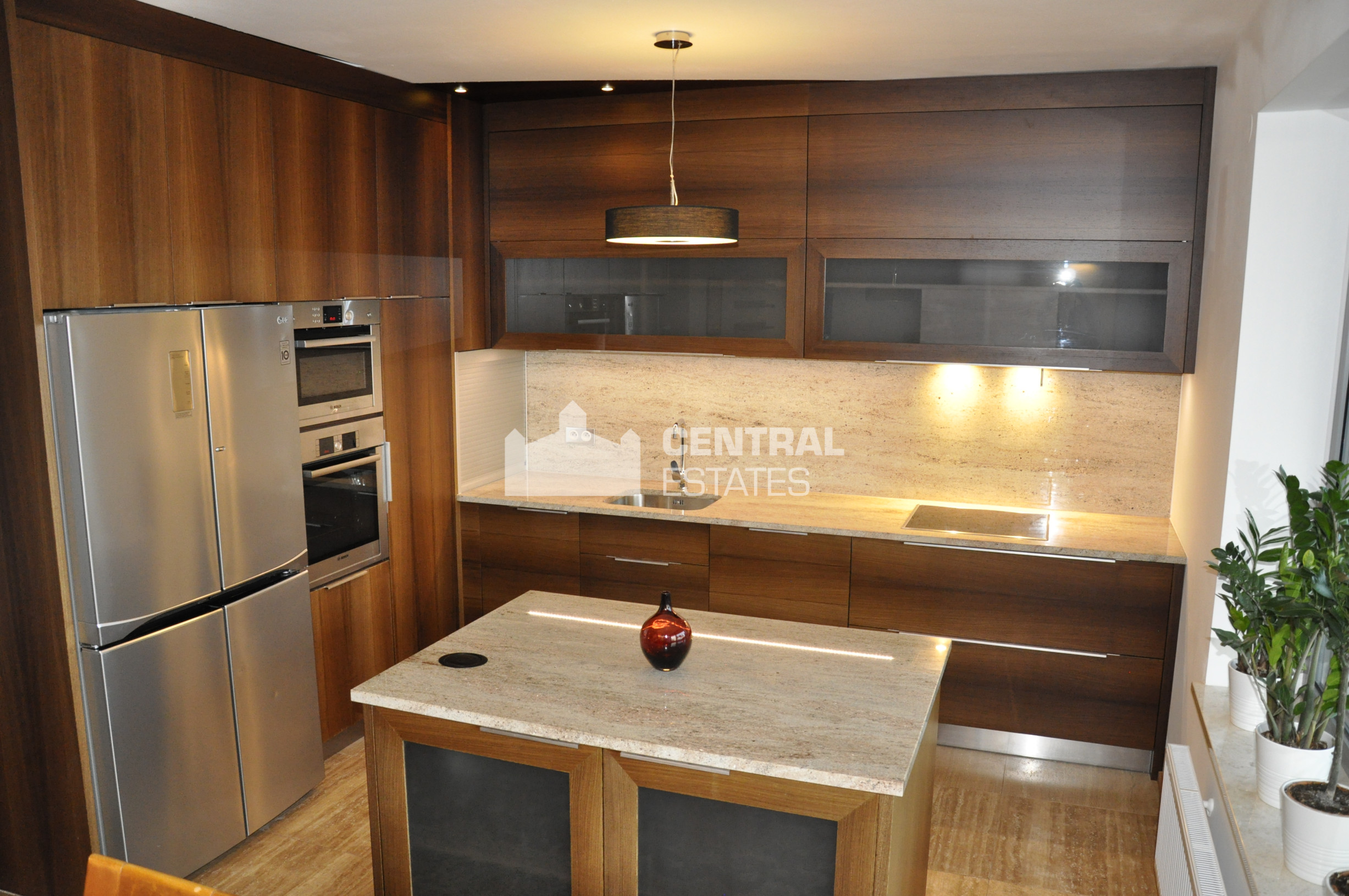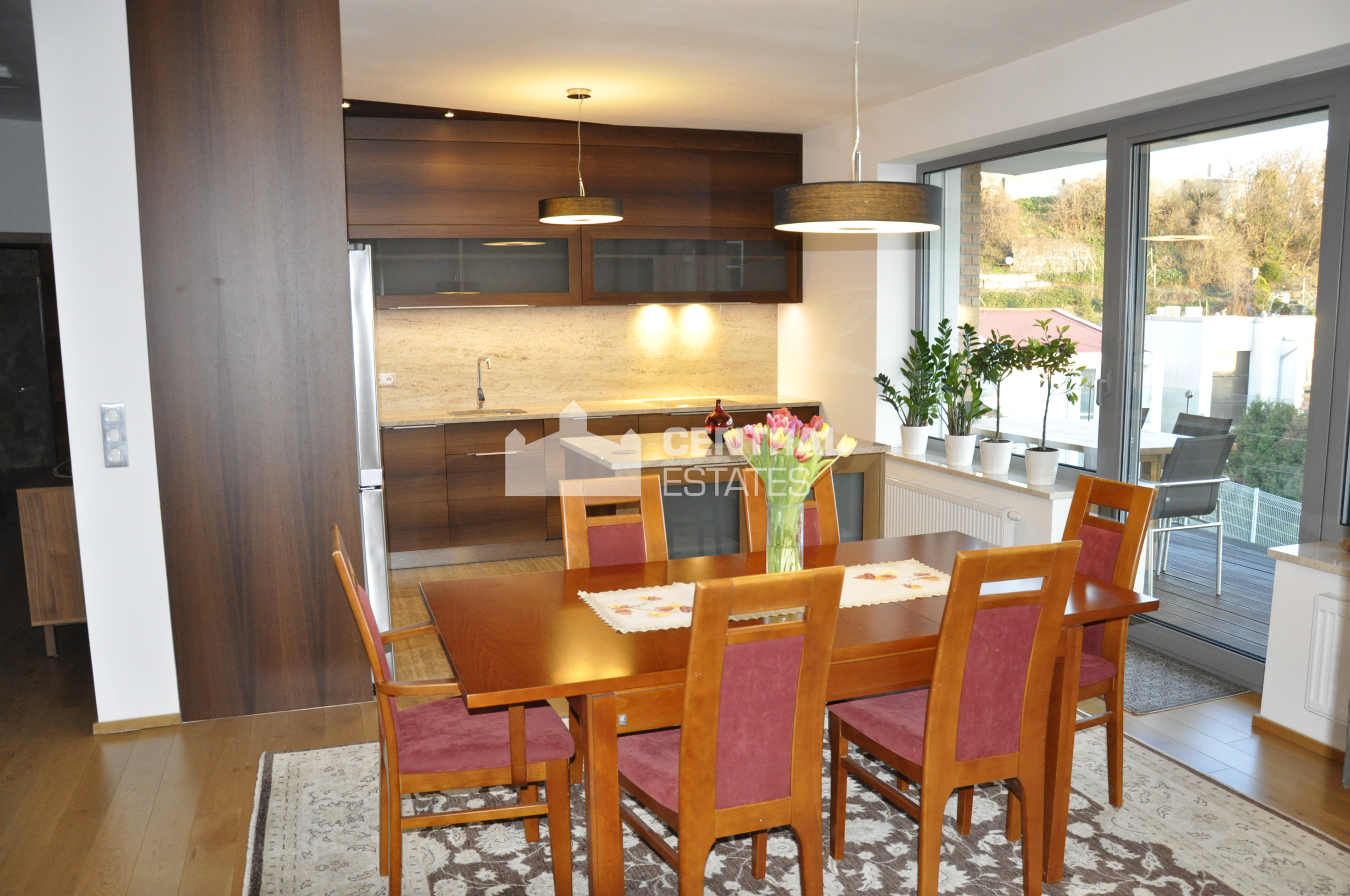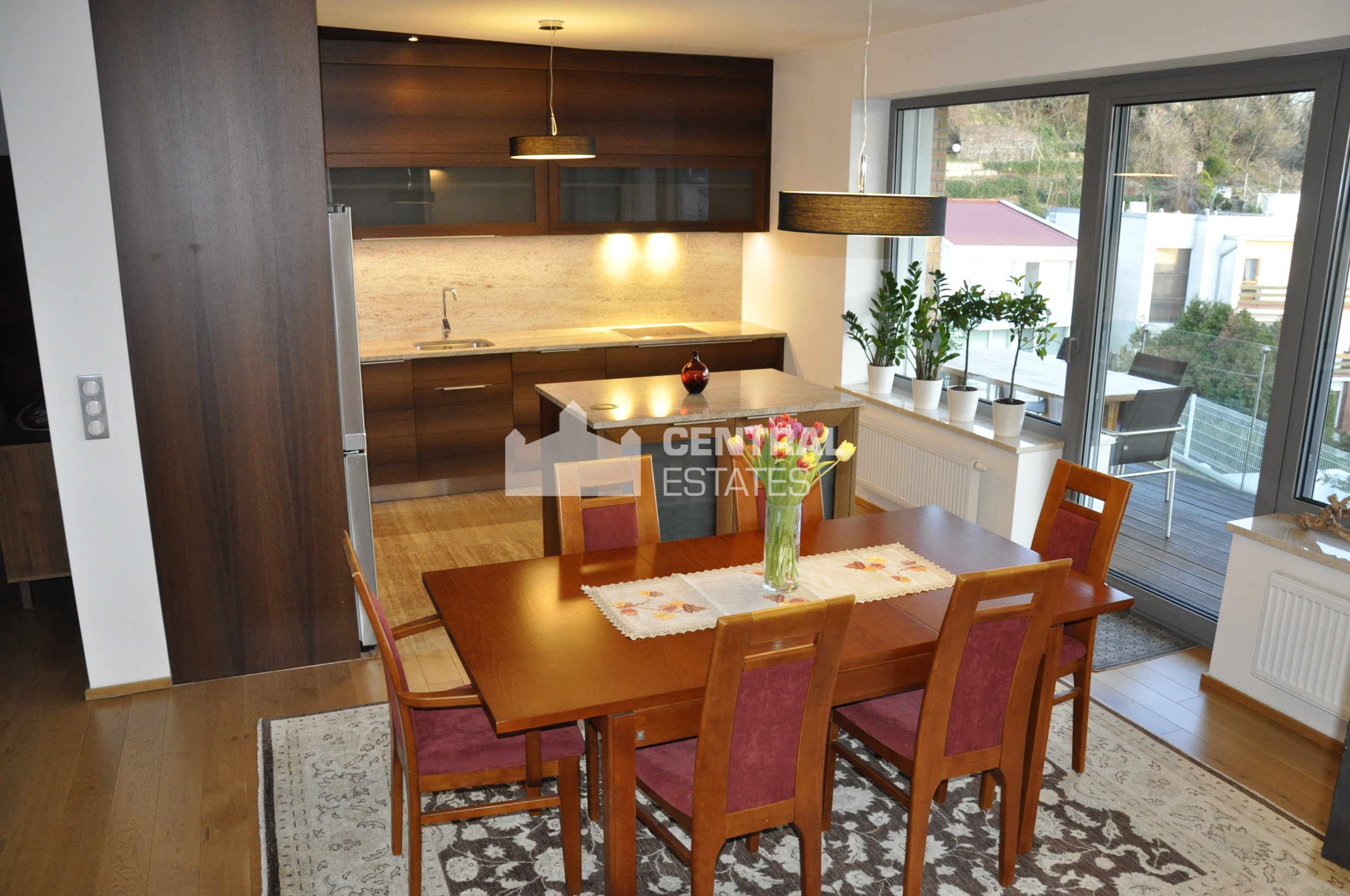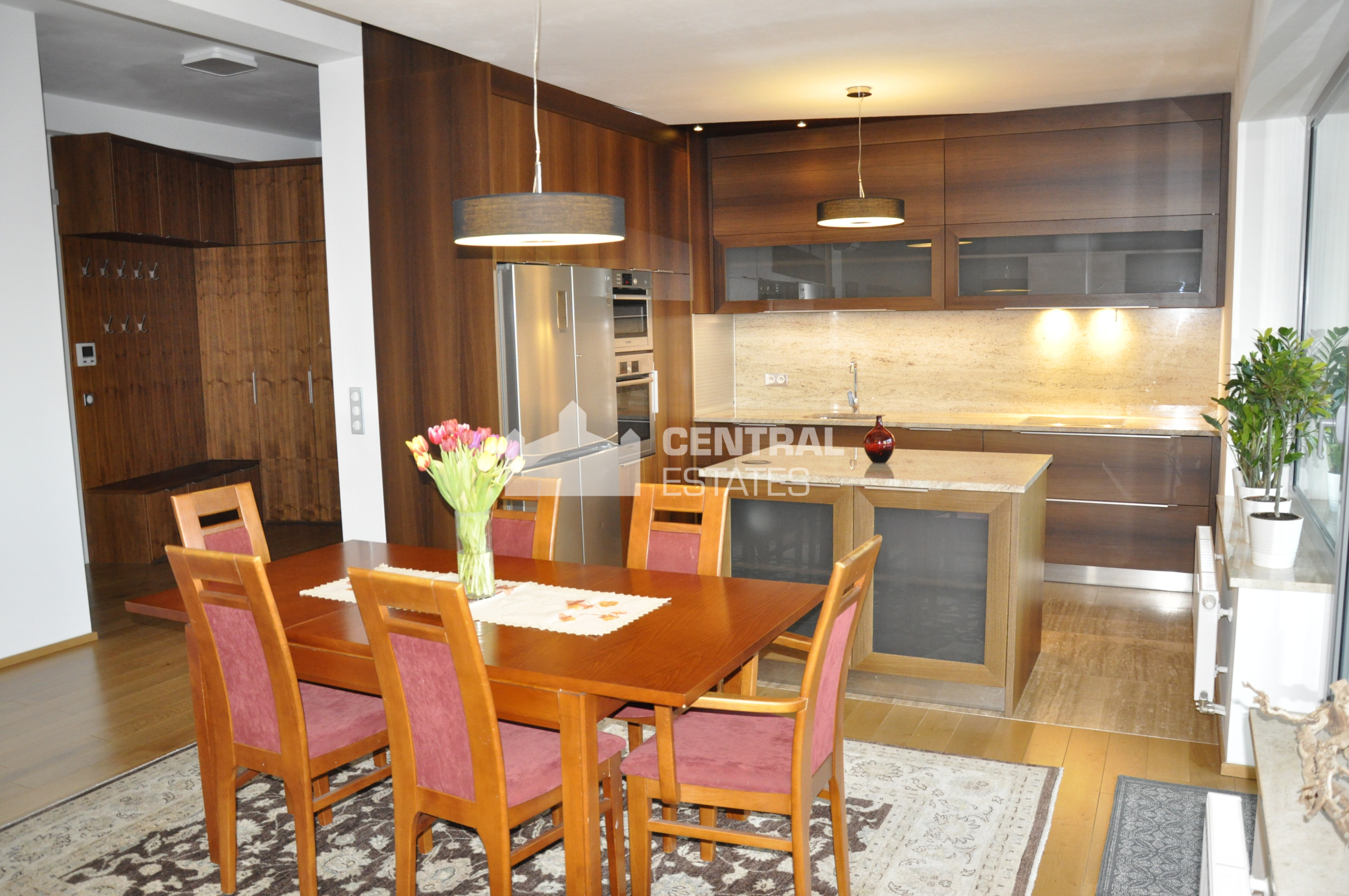 Byt pozostáva z priestrannej obývacej izby s krbom prepojenej s veľkou kompletne vybavenou kuchyňou, troch samostatných izieb, toalety s umývadlom, kúpeľne so sprchovým kútom, vaňou a toaletou. K bytu prislúcha priestranná otvorená terasa s krásnym výhľadom, balkón a dve parkovacie státia v garáži. V byte je množstvo úložného priestoru, prenajíma sa zariadený, kuchynská linka je z amerického orecha a s žulovou doskou, vybavená vstavanými spotrebičmi: práčka, umývačka riadu, mikrovlnná rúra, elektrická rúra, odsávač pár, indukčná varná doska (Siemens), samostatne stojaca americká chladnička značky LG. Vo všetkých miestnostiach sa nachádza klimatizácia, vonkajšie elektrické hliníkové žalúzie, byt je vybavený alarmom, kamerovým systémom, centrálnym vysávačom, veľkoformátové hliníkové okná s izolačným trojsklom, bezpečnostnými vstupnými dverami. Byt má svoj samostatný vstup. Pre nájomcov je k dispozícii prístup na záhradu.