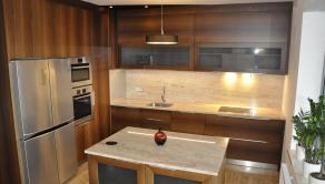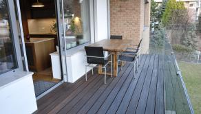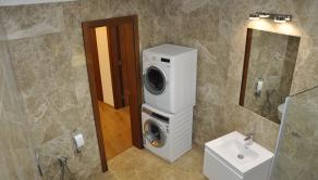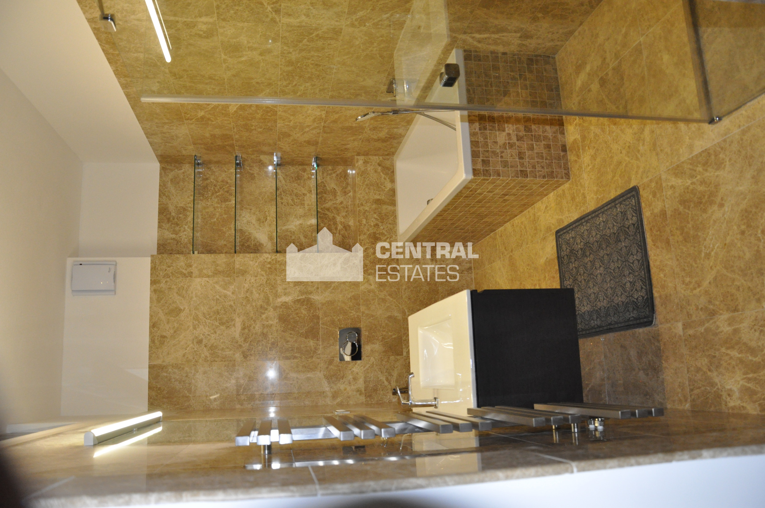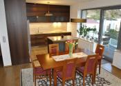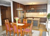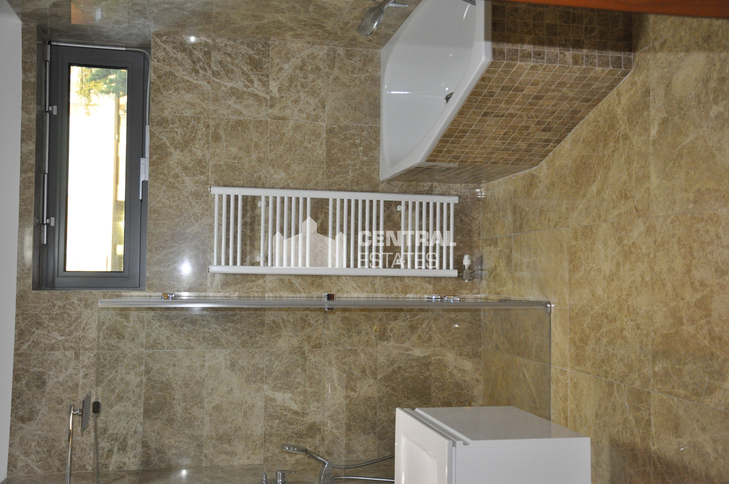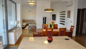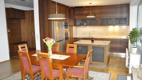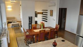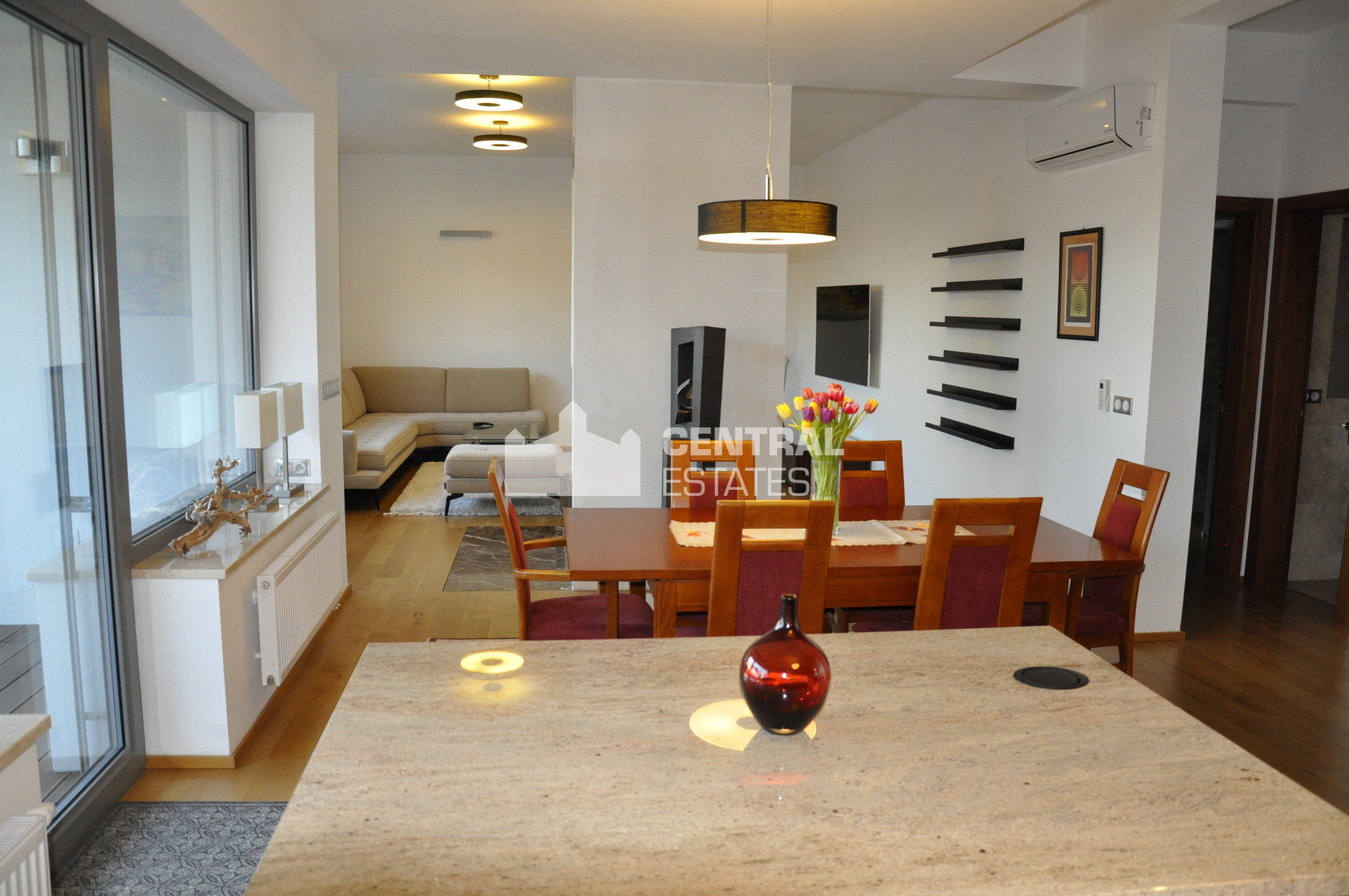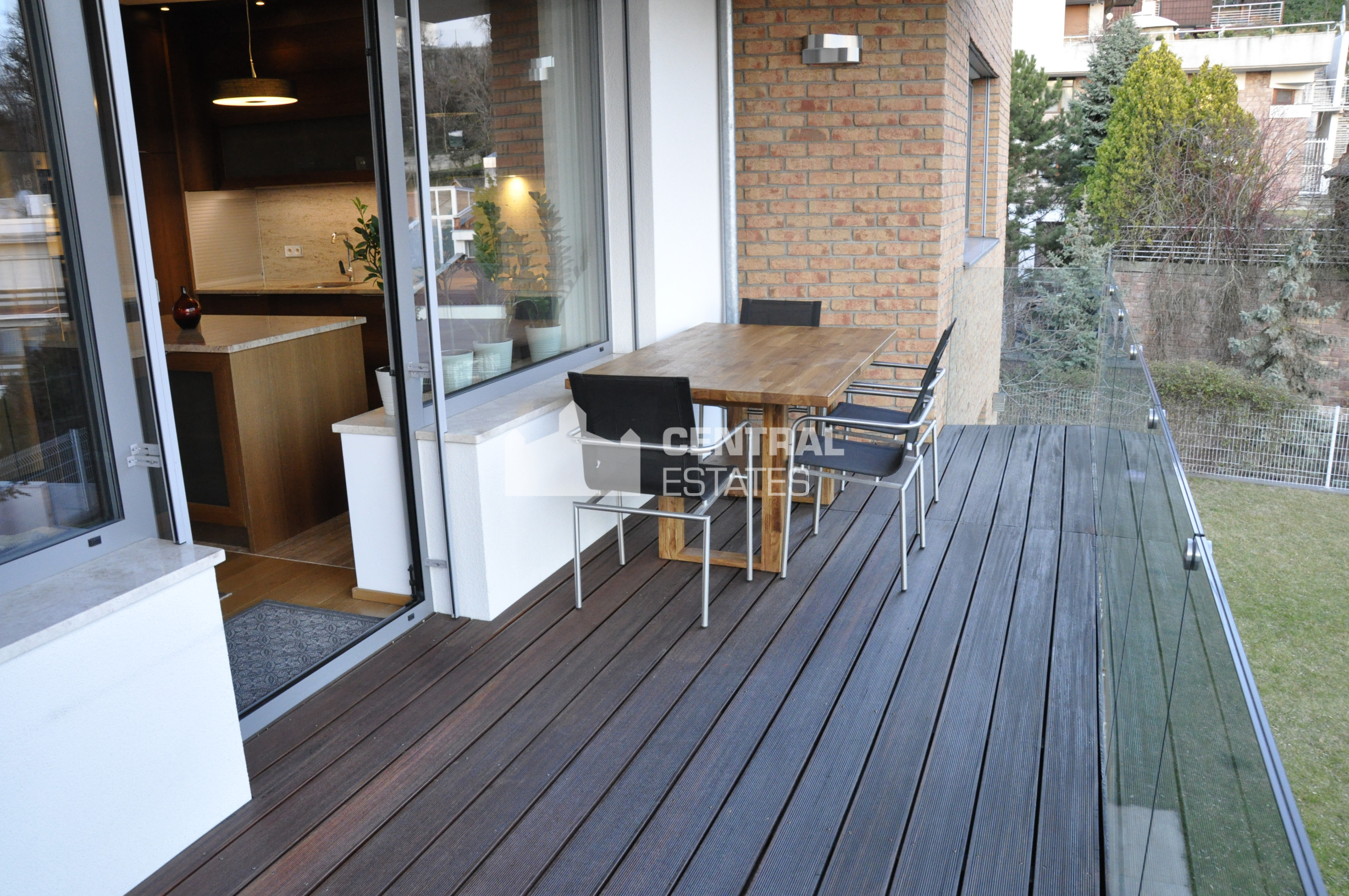 Byt pozostáva z priestrannej obývacej izby s krbom prepojenej s veľkou kompletne vybavenou kuchyňou, troch samostatných izieb, toalety s umývadlom, kúpeľne so sprchovým kútom, vaňou a toaletou. K bytu prislúcha priestranná otvorená terasa s krásnym výhľadom, balkón a dve parkovacie státia v garáži. V byte je množstvo úložného priestoru, prenajíma sa zariadený, kuchynská linka je z amerického orecha a s žulovou doskou, vybavená vstavanými spotrebičmi: práčka, umývačka riadu, mikrovlnná rúra, elektrická rúra, odsávač pár, indukčná varná doska (Siemens), samostatne stojaca americká chladnička značky LG. Vo všetkých miestnostiach sa nachádza klimatizácia, vonkajšie elektrické hliníkové žalúzie, byt je vybavený alarmom, kamerovým systémom, centrálnym vysávačom, veľkoformátové hliníkové okná s izolačným trojsklom, bezpečnostnými vstupnými dverami. Byt má svoj samostatný vstup. Pre nájomcov je k dispozícii prístup na záhradu.